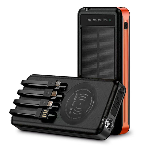 Solar Power Bank portable charger with 1 USB output, 3 Built-in Cable output and Wireless output, supports charging for multiple devices same time, no worry about not being able to charge because forgot to carry cable.